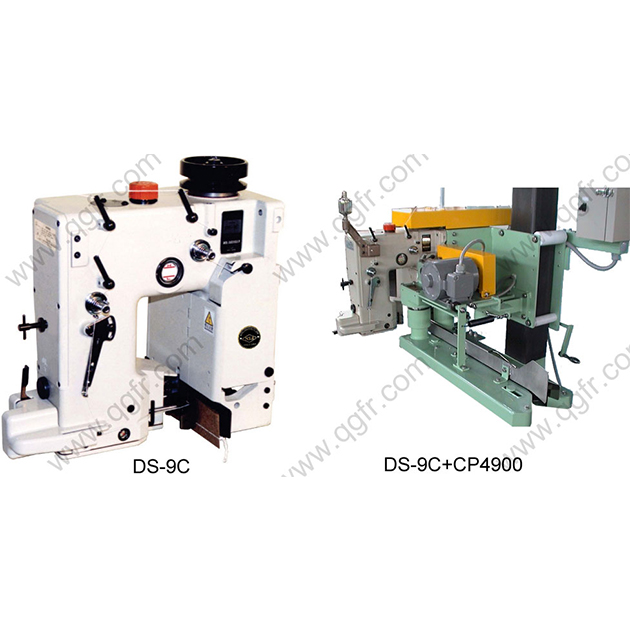 DS-9C Heavy Duty Bag Closing Machine: The fastest single needle bag closing machine (2700 rpm) for all kinds of filled bags. Well-balanced rotational parts ensure very little vibration. Ideally suited for use with height-speed bag filling lines where conveyor speed of 25m/min. All parts are protected against the effects of dust. A unique but simple enclosed oil bath lubrication system greatly extends the life of moving parts and reduces maintenance costs. Model DS-99 is equipped with pneumatic guillotine type crepe-tape cutter.