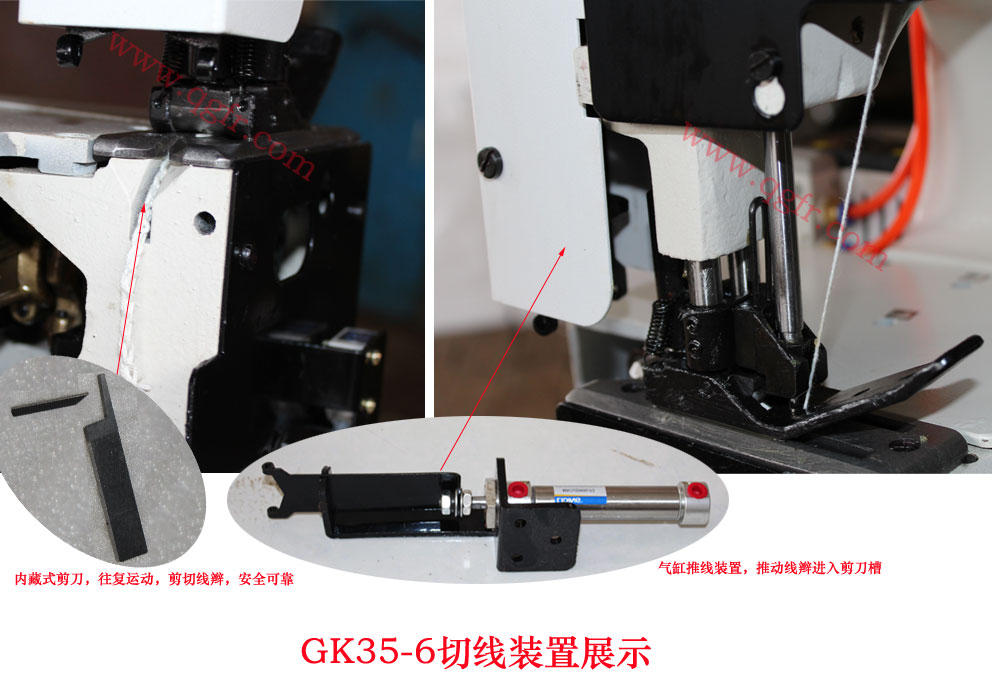 b.GK35-6A型全自動(dòng)縫包機(jī),采用切刀式結(jié)構(gòu),在氣缸推動(dòng)下,上刀與下刀配合完成切線動(dòng)作,切線更加可靠,而且能夠同時(shí)切斷皺紋紙等。